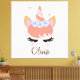 Sweet peach pastel colored unicorn design on a light pastel color background, with a customizable name. Wall art canvas print for little girls room decor. Great as a gift for newborn baby girl or for baby shower or for a birthday for a toddler girl.