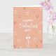 This Valentine’s Day card features “HAPPY Valentine’s DAY” centered in crisp white, with “HAPPY” and “DAY” in a simple, modern style and “Valentine’s” in a flowing cursive look. Set on a warm peach background, the layout feels gently romantic, like a quiet note passed between close friends or sweethearts 🥰. Small hearts drift around the text, mixing thin white outlines with solid red shapes that add little sparks of affection ❤️. The hearts are scattered across the top and sides, giving the design a light, floating motion without crowding the message. Near the bottom, a minimalist white vase sits as a calm focal point, as if it’s been set down carefully on a table. Three heart-shaped blossoms rise from the vase, echoing the heart motif above and tying the whole scene together. The red hearts stand out against the peach field, while the white lettering and vase keep everything soft and airy. At the center of the card is a warm peach backdrop dotted with red and white hearts, and a small white vase holding three heart-shaped flowers near the bottom.