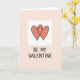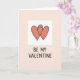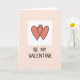 This Valentine card features two coral-colored hearts outlined in slightly uneven black lines, gently overlapping as if one is hugging the other. The hearts sit inside a white square in the middle, which stands out against a soft peach background. The simple lines and small imperfections make the drawing feel warm and human, like it was made with care. Under the hearts, the text reads “BE MY VALENTINE” in black, using plain, casual uppercase letters. The words are centered near the bottom of the white square, so your eye moves from the hearts straight down to the message. Overall, it feels sweet, calm, and romantic without trying too hard.