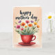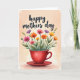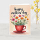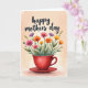 This card features a watercolor-style illustration of a deep red teacup on a matching saucer, set against a soft peach-to-cream background that fades like a gentle glow. From the cup, a loose bouquet of wildflowers rises on thin green stems, with petals in fuchsia, orange, yellow, and light lavender, leaning toward one another as if sharing a quiet moment ❤️. Small buds, scattered leaves, and a few airy paint splashes add a natural, just-picked look, like a sweet offering between close friends. Near the top, a short greeting appears in flowing, cursive-style lettering, centered above the flowers. The text is a dark gray tone that stands out without overpowering the artwork, keeping the focus on the bouquet. The overall layout leaves comfortable open space around the illustration, giving it a calm, airy feel 🌼. The red cup sits slightly below center with the saucer’s curved rim visible, while the flowers fan upward to fill the upper half of the design.