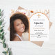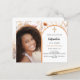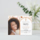 Add your own vertical size photo. A rose gold arch shaped photo frame. Decorated with rose gold, peach, beige wildflowers and a golden cross. Personalize and add a name and details.