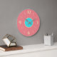A simplistic clock in peach with aqua centre and lemon numerals. Available in round and square shapes.