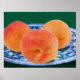 Plump ripe peaches sits on a blue tiled plate just ready to eat. The original is a miniature oil painting by Kathie Miller