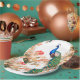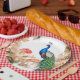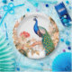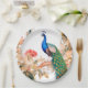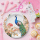 Paper party plates with image of a peacock surrounded by beautiful flowers.
