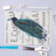 A vibrant blue and green peacock bird on a French ephemera background advertising a Parisian business. Great for decoupage.
