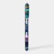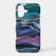 Blue, teal, and violet purple combine to make a stunning abstract design on this phone case. The colors are separated by gold faux glitter lacing, and your name or monogram appears in light blue near the center.