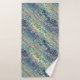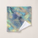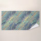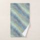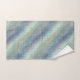 This set of three bathroom towels (each of which can be ordered separately) comprises a mix-and-match ensemble of varied patterns based on peacock colors: teal, aqua, turquoise, gold, and blue. One design displays rounded squares and circular forms; another shows soft, wavy, diagonal stripes; the third features a modern, scribbled plaid effect in the same color scheme.