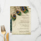 COLOR PALETTE: cream, tan, cream, royal blue, green, and rust. DESIGN: Matching Dinner Menu Card. The bride and groom's names and wedding date are on the front of this design. This antique vintage inspired wedding collection has a complete ensemble of products and can be created in several colorways. If you would like it to match your wedding let us know via email and we'll be happy to assist you. This design consists of a stately peacock on a tree branch vintage art element layered three peacock feathers and over an angel etching, swirls, antique handwriting, hand painted lace overlaid on parchment and a beautiful original art damask pattern. The background color can be changed to match your wedding.
