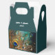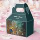 A beautiful generative content ai design featuring a 3D looking peacock feather in gold, emerald green and blue set against a dark teal blue background that has editable white text templates on it for your custom wording. This elegant and luxurious graphic is ideal for any "peacock themed" wedding, function or event.