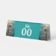 A beautiful iridescent peacock feather is set against a marbled teal blue background that makes the plume pop. Both sides of the frame have the same design and the middle has a plain teal blue background on which white editable templates for your table number appear. The lettering is bold and clear and is ideal for "peacock themed" weddings; corporate events and any celebration you may be hosting.