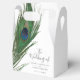 A unique Peacock Feather-themed set of white gift favor boxes tailored specifically to your future wedding event. There are your wedding details on the front and your unique wedding guests thank you message on the reverse side.