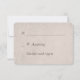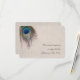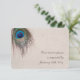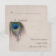 A pretty blue, tan, and green peacock feather is at the top left of this wedding response card. Your custom text is in brown at the lower right. The images and text are placed on a distressed light gray tan background which complements the colors in the feathers. The back of the invitation has a matching background with more custom text fields. This card matches the Peacock Feather Border Wedding Invitation in our store.