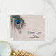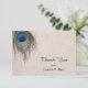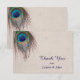 A pretty blue, tan, and green peacock feather is at the top left of this wedding thank you card. Your custom text is in matching blue at the lower right. The images and text are placed on a distressed light gray tan background which complements the colors in the feathers. The back of the card has a matching background with another custom text field. If you prefer, you may blank out the text to hand write your own message. This card matches the Peacock Feather Border Wedding Invitation in our store.