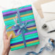 Recyclable, glossy wrapping paper in a 2' x 6' roll with a peacock feather design in purple, green, turquoise and gold.