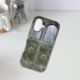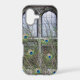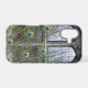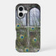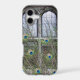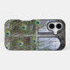 Cool looking and trendy iPhone hard-shell case that features a photo image of colorful peacock fantail feathers against the background of Gothic style windows. Select your iPhone case style.