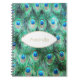 Personalized spiral notebook with a brightly colored pattern of exotic and wild peacock feathers in pretty teal, jewel green, aqua and cobalt blue. A fancy oval shape with a gold gradient border in the center for you to add your personalized name, text or title. Artistic and fancy, created with watercolors. A chic and stylish design.