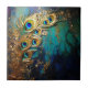 A plume of beautiful 5D looking peacock feather rosettes appear to sparkle and shine against a dark blue, green and beige marbled background. The feathers bend gently to the right and faux golden flecks of sea foam surround it. This graphic is inspired by the art nouveau movement and is NOT a seamless pattern. It is ideal for hotels, resorts, villas, lodges and penthouse apartments that want to add an accent detail to their walls. Suited to kitchen backsplashes, bathrooms or as a kitchen trivet too