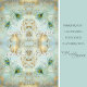 One of a pair of images, right side version for matching doors. "Peacock Feathers Gold and Dusty Blue Decoupage Tissue Paper." One of Audrey Jeanne's most loved paintings now available in tissue paper to decoupage! These peacock feathers are set amongst elegant gold foil gilded scrollwork, peacock feathers and a grayed blue background. Painted in oil pastel by internationally licensed artist and designer, Audrey Jeanne Roberts, copyright.