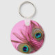 Beautiful pink keychain with colorful peacock feathers close-up.