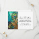 The left edge of the invitation is delicately adorned with four luxurious peacock feathers, each one trimmed with elegant faux gold. These iridescent feathers appear to shimmer in hues of deep blue and emerald, bringing a sense of opulence to the card. To enhance the design's ethereal quality, small pearls rest gently on the outer plumage, adding a touch of refined charm.