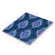Ceramic tile in a peacock feather textile print - light sky blue feathers, with an eye in shades of violet, amethyst purple and turquoise, on a dark navy / indigo blue background