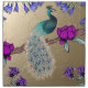A colorful peacock is perched on a branch adorned with vibrant flowers. The background features a gold tone with textured details, enhancing the overall elegance of the scene.