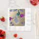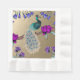A colorful peacock is perched on a branch adorned with vibrant flowers. The background features a gold tone with textured details, enhancing the overall elegance of the scene.