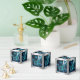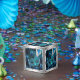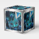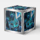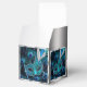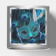 Peacock masquerade party favor box. Beautiful silver and royal blue masquerade party favor box with beautiful teal blue feather mask on an elegant blue peacock feather background.
