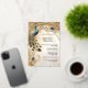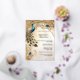 A stylish and elegant design on a pale beige marbled background edged with art nouveau detail has a radiant and shimmering peacock standing on the left edge and two idential feathers in the top right and bottom left corners. The peacock has its tail feathers down and has curved its tail around it so that the rosettes on the feathers fall a soft plume falling down from its body. Its iridescent blue chest feathers radiate light and the two feathers are edged with small delicate pearls. Real foil editable templates appear on the marbled background and the back has the same design and a further template for additional information, if required. If not, simply clear the wording. This is ideal for a "peacock theme" wedding, bridal shower, engagement, anniversary or couples shower.