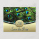Peacock Save the Date Wedding Cards are schemed in gorgeous shades of greens, blues, aqua and gold. Each card is elegantly decorated with silver jewels with diamond accents. The front features a monogram, that you can customize to the groom-to-be's last initial. The front bottom area is shaded in gold with cursive, fancy lettering. The back features the same gold coloring with jewels, diamond accents and one solitaire larger diamond. Click on the orange customize button below the demo card or use the personalize feature to the right to quickly customize the details to your wedding information. If you love this design, view matching wedding invitations, RSVP cards and more below: