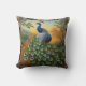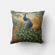 A peacock stands proudly, showcasing its colorful feathers against a serene backdrop of autumn trees and warm hues.