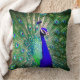 Throw pillow with image of peacock on front and silhouette of peacock feather on back. Background colors in deep blue.