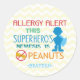 Personalized boys blue superhero silhouette peanut allergy stickers with yellow chevron stripe background. Allergy Alert: This Superhero's nemesis is peanuts. Food allergy alert stickers. Remind others of food allergies. Personalize with name or other text. Great for use at school or daycare to help alert others of a food allergy. Attach to backpacks or medical bags to alert that epinephrine is inside the bag. Designs by Lil Allergy Advocates www.lilallergyadvocates.com
