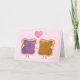 Peanut butter and jelly love greeting card - peanut butter and jelly on bread, holding hands with a big pink heart above them.