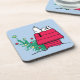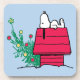 Enjoy this Peanuts holiday design featuring Snoopy sleeping on his dog house beside his Christmas tree.