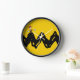 The size of the clock is dramatic and the abstract alcohol ink design is soothing and intricate at the same time. I chose the black frame that adds pop to the blue and gold design. The gold printing would be better in a slightly darker or larger font. I love it and I’m looking for just the right place in ny new apartment. I would recommend this clock for a personal gift or a present. I feel that the quality is excellent for the money! I’m a bit of a clock nut so I’m pretty particular about my purchases. The clock is larger in diameter than many if the clocks I have, so it stands out very well. I think a slightly darker printing color and a moderately larger size would best suit a professional decor or add more impact in a work place item.