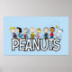 Check out this lineup of the Peanuts gang together, featuring Schroeder and Lucy, Linus with his blanket, Charlie Brown and his sister Sally, Pigpen, Franklin watching Snoopy dance, and Woodstock flying overhead.