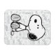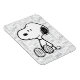This Peanuts artwork features Snoopy sitting on background of black and white Charles M. Schulz comic strips.
