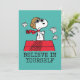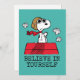 Soar to new heights of confidence with this inspiring and adorable greeting card featuring the legendary Flying Ace, Snoopy! This vibrant card captures Snoopy in his iconic aviator cap and red scarf, bravely "flying" atop his trusty red doghouse, with little white clouds accentuating his aerial adventure. Below this classic image, the uplifting message "BELIEVE IN YOURSELF" is boldly printed. Perfect for encouragement, graduations, new beginnings, or just a thoughtful reminder, this card is sure to motivate and bring a smile to any fan of Snoopy and the Peanuts gang!