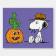 Spike, with his signature droopy mustache and thin frame, wears a slightly worn-out hat that adds to his desert-dweller charm. The jack-o'-lantern has a crooked smile, with uneven teeth and triangle-shaped eyes, looking mischievously spooky. The cactus stands tall behind the pumpkin, adding a bit of that desert flair to the scene, almost like it's a part of the Halloween celebration itself.