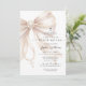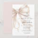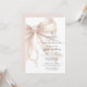 This First Holy Communion invitation features a soft blush beige satin bow made from a pearl rosary, complete with a dangling cross and heart-shaped pearl center detail. The elegant religious design is placed on a clean white background with modern mixed typography, creating a refined and meaningful look for a girl’s communion celebration. Perfect for a Catholic sacrament event, this invitation combines delicate rosary symbolism with graceful script and serif text for a timeless and feminine style. Personalize the wording with your child’s name, date, time, and event details.