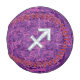 A mother of pearl Sagittarius zodiac symbol on a vibrant fuchsia pink digital camouflage design print background. A modern urban racy design for a great custom birthday gift idea.