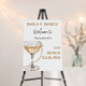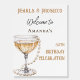 A welcome sign for a birthday party. A chic white background. Decorated with a a glass of golden bubbles and pears. Personalize and add a name. Black and golden letters.