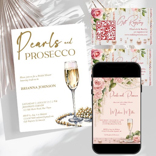 Plain white envelopes are included with paper invitations and will come to fit the invitation size you select. If you don’t need the envelopes, you may choose to not receive them by selecting the dropdown below "Envelopes" and choosing "None." If you’d like to have a design on your envelopes, you can browse all of these available envelopes to find the design that complements your Pearls And Prosecco Bridal Shower Elegant Invitation.