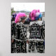 This vibrant photo captures a moment in London's Trafalgar Square, featuring two Pearly Queens in their magnificent, hand-sewn costumes. The image highlights the intricate details of their traditional "pearly" suits, which are adorned with hundreds of mother-of-pearl buttons. From the bright, feathered hats to the unique designs on their jackets, each element tells a story of a cherished London tradition and the city's rich cultural history. This poster is a perfect piece for anyone who loves British culture, unique fashion, or historical street photography.