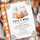 Peek a boo, a little ghost is due! Our adorable Halloween baby shower invite features watercolor parent ghosts and their baby ghost in a pumpkin against a white background. Perfect for a spooky-sweet celebration! You can customize this further by clicking on the "PERSONALIZE" button. Matching Items in our shop for a complete party theme.