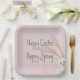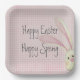 Cute peeking pink Easter rabbit on white and pink gingham background