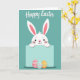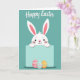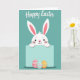 Designed with a sweet digital illustration, a fluffy white long-eared bunny 🐰 peeks from behind a rounded pale-blue panel, as if leaning in to share a quiet moment with the viewer. Its wide dark eyes, tiny pink nose, and fine whiskers give it a tender, friendly look, and the upright ears with soft pink interiors add a gentle blush of color. The background is a smooth deep teal field that makes the lighter foreground tones stand out. Near the top, a seasonal greeting appears in white flowing lettering, centered and spaced to feel airy against the dark backdrop. The bunny’s paws rest along the panel edge, suggesting a shy, affectionate hello rather than a loud announcement. Along the bottom of the panel sit three decorated eggs 🌷 with simple stripe patterns: one in soft pink on a light base, one in pale blue on a slightly deeper light-blue base, and one in orange on warm yellow. Light shading beneath the eggs and along the panel edge adds a soft sense of depth, with the teal background staying flat and uniform behind them.