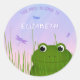 This whimsical frog book label sticker for a girl or a boy features an illustrated green frog with big eyes that appears to be hidden in tall grass at the lower edge of the sticker, keeping watch for what may be approaching from the distance, peeking through a few blades of grass under a blue sky that has a pinkish hue - customize with child's name - by katz_d_zynes