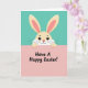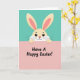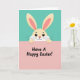 This design shows a sweet cartoon rabbit with soft cream fur peeking up from the bottom edge, meeting the viewer with wide black eyes that feel like a friendly, affectionate glance 🐰. Its long ears stretch upward with pale pink inner details, and a small rosy nose sits above a few fine whisker lines. The rabbit’s front paws rest on the top edge of a large soft-pink rectangle that fills most of the lower area, like it’s leaning in to share a quiet moment. Behind it, a muted teal background keeps the scene calm and airy, letting the warm pinks stand out. Centered on the pink rectangle is a seasonal greeting in black, written in flowing cursive-style lettering that reads clearly against the light backdrop 🌷. The text sits comfortably above the rabbit’s paws, leaving generous space around the words so the design feels open and easy to read. The overall layout balances the tall ears and open background with the wide pink banner, drawing your eye from the rabbit’s gaze down to the centered message. The teal field is smooth and untextured, while the pink rectangle has crisp edges and the rabbit’s ears rise nearly to the top of the card.